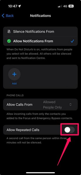 7.Deretter, hvis du ikke vil at iPhone skal omgå et nytt anrop fra en kontakt innen tre minutter når Ikke forstyrr-modus er aktivert, kan dudeaktiver bryterenforTillat gjentatte anropalternativet på denne siden.