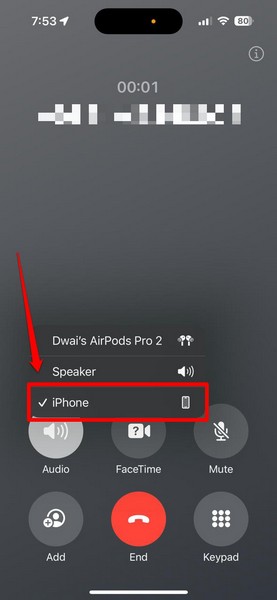 Ganske enkelttrykk på den for å åpne kontekstmenyenogvelg iPhone-alternativetfor å stille inn ørehøyttaleren som utgangskilde for samtalelyd. På denne måten vil enheten din bruke ørehøyttaleren til å sende ut samtalelyden.