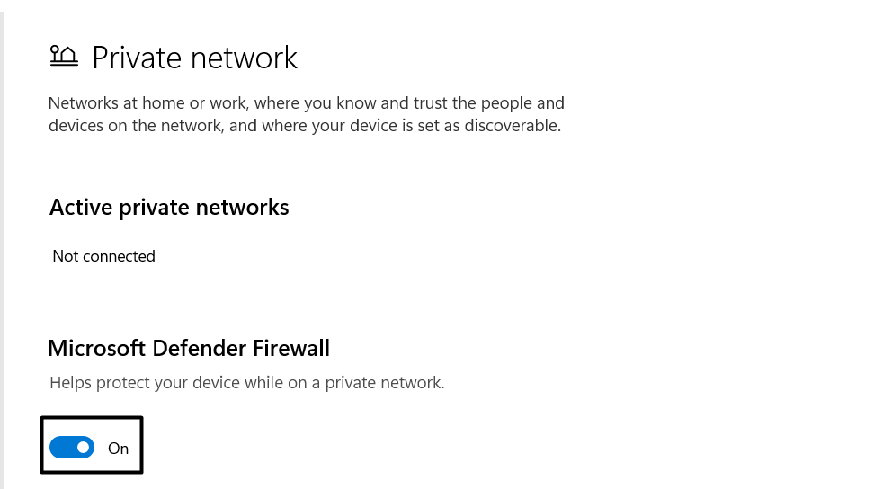 3.Klikk påPrivat nettverkalternativet og slå av bryteren underMicrosoft Defender brannmur.