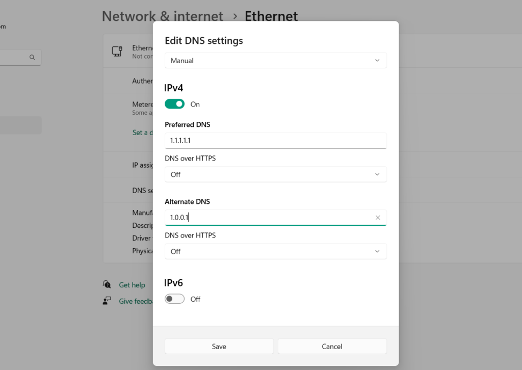 3.IRediger DNS-innstillingerledetekst, velgHåndbokfra menyen og aktiver deretterIPv4alternativ.