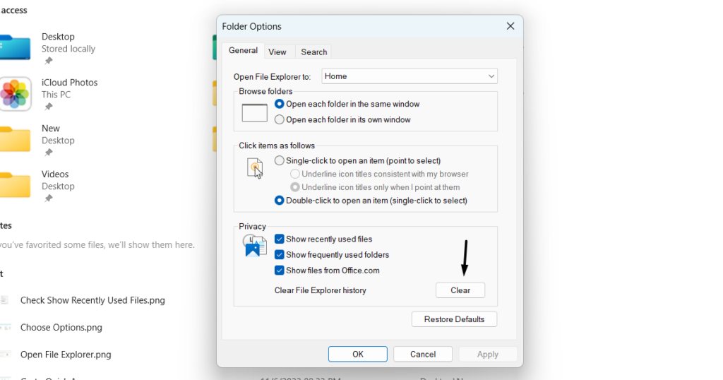 2.IAlternativer for filutforskervindu, klikkKlarved siden avTøm File Explorer-historikkentekst.