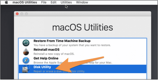 Trinn 2 –Når Mac-en starter opp i gjenopprettingsmodus, går du til Diskverktøy> Fortsett> Verktøyterminal.
