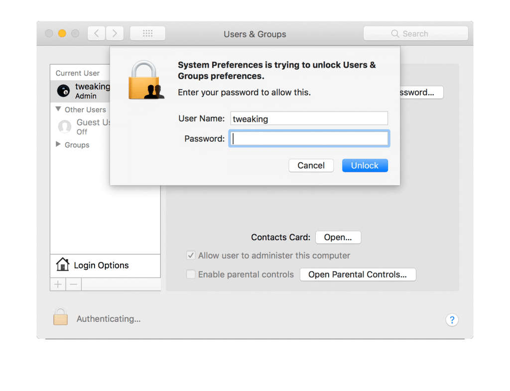Trinn 3 –Når du har skrevet inn administratorpassordet, klikker du på låseikonet som du kan se i nedre venstre hjørne. Klikk påLåse opp.