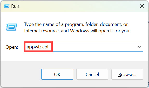 1.Trykk på Windows + R og skriv innappwiz.cplfor å åpne programmer og funksjoner kontrollpanel.