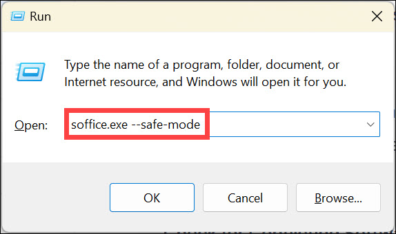 2.Skriv eller kopier og lim inn følgende kommando og trykk enter:soffice.exe –sikker modus