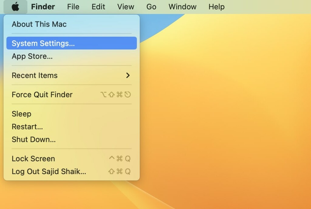 1.Klikk påEplemenyøverst til venstre på skjermen og velgSysteminnstillingerfra listen.