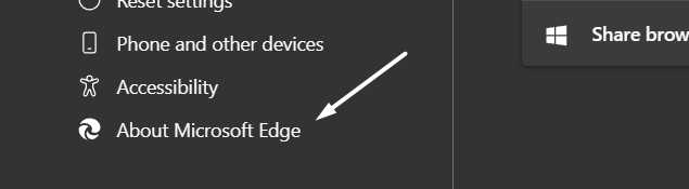 2.Fortsett deretter tilOm Microsoft Edgefra venstre navigasjonsrute for å søke etter oppdateringer for nettleseren.