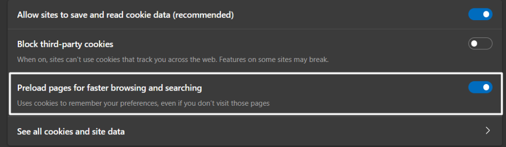 De sa også at deaktivering av Preload Pages-funksjonen kan løse problemet. Vi foreslår deg ogsådeaktiver alternativet Forhåndslast sideri Microsoft Edge-nettleseren for å se om det eliminerer problemet. Sjekk trinnene nedenfor for å gjøre det samme: