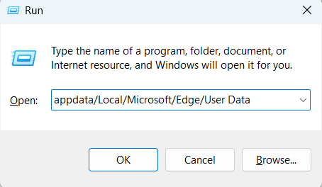 1.For å starte, åpneLøpved å brukeWindows + Rsnarvei, skrivappdata/Lokal/Microsoft/Edge/Brukerdatai den, og trykkGå.