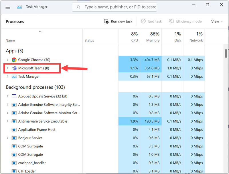 2.Bytt tilProsesserfanen og se etterMicrosoft Teamsbehandle.