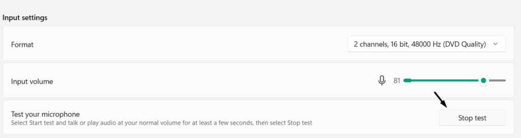 5.Etter å ha trykket på den nevnte knappen, si noe i noen sekunder og klikkStopp testen.