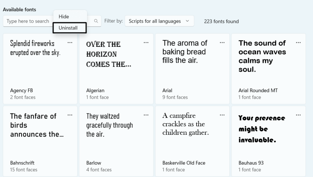 3.Velg fonten, og klikk påAvinstallerfor å slette skriften fra din Windows-PC eller bærbare datamaskin.
