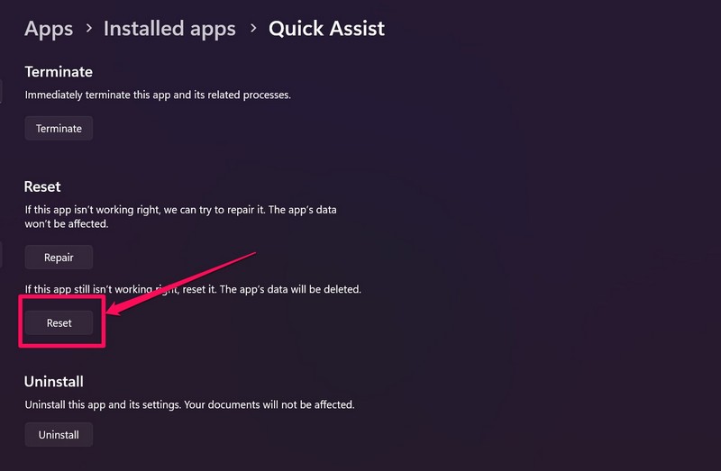 Hvis reparasjonsprosessen ikke løste problemet med at Quick Assist ikke virket i Windows 11, følger du trinnene nedenfor for å tilbakestille appen på enheten din: