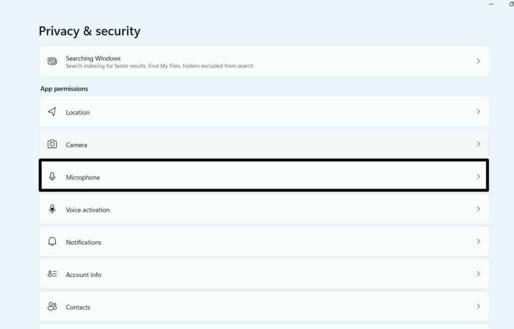 3.På neste skjerm, sørg for atMikrofontilgangtoggle er aktivert og se etterSkypeapp.