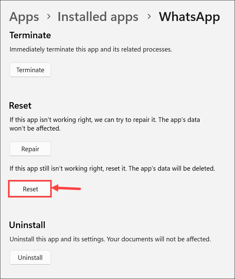 Hvis ingen av trinnene ovenfor løser problemet ditt, må du kanskje installere WhatsApp Desktop-appen på nytt på Windows 11-systemet.