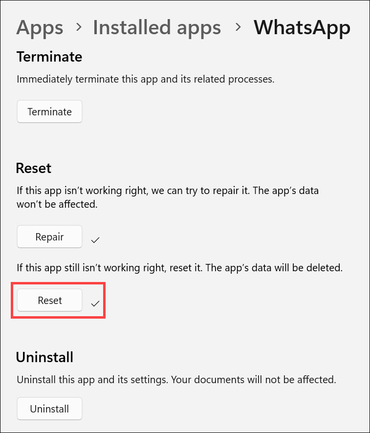 7.Systemet vil begynne å tilbakestille WhatsApp-appen, og etter at den er fullført, vil det være et hakemerke ved siden av Tilbakestill-knappen.