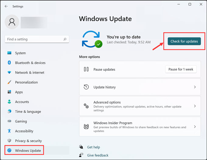 2.Bytt tilWindows Updatedelen til venstre og klikk påSe etter oppdateringerknappen til høyre.