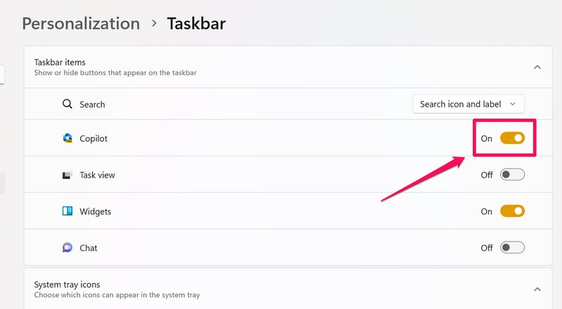 3.På den neste siden, sørg for at bryteren forCopilotalternativet underElementer på oppgavelinjendelen eraktivertpå din PC eller laptop.