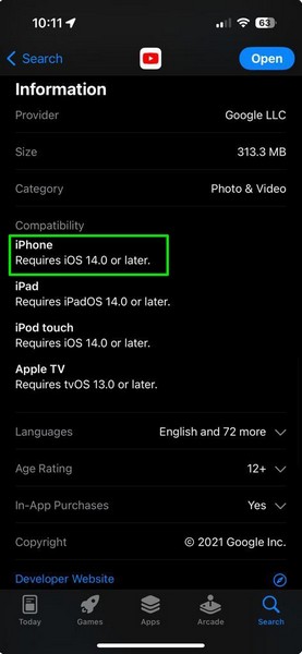 Dessuten er det viktig å merke seg at YouTube-appen på iPhone krever minst iOS 14 eller nyere iOS-versjoner. Så hvis du kjører iOS 13 på iPhone, vil ikke appen være kompatibel med enheten din.