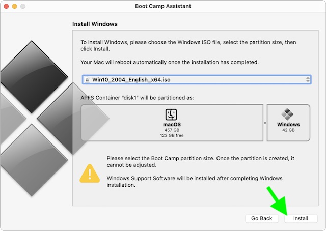 4.I tilfelle du bare har én intern disk, velgWindows ISO-bilde. Etter det, sørg for å spesifisere partisjonsstørrelsen ved å dra skillelinjen som viser mellom macOS- og Windows-partisjonene. Så, treffInstallerfor å fortsette.