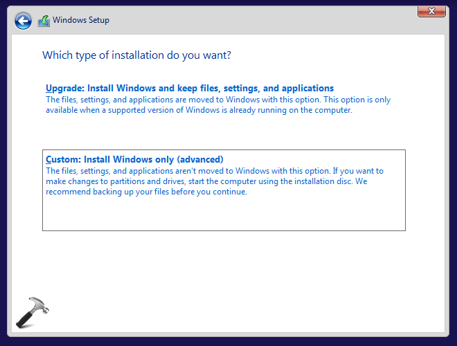 7.VelgeEgendefinert: Installer kun Windows (avansert)på neste skjerm, mens vi gjør en ren installasjon.