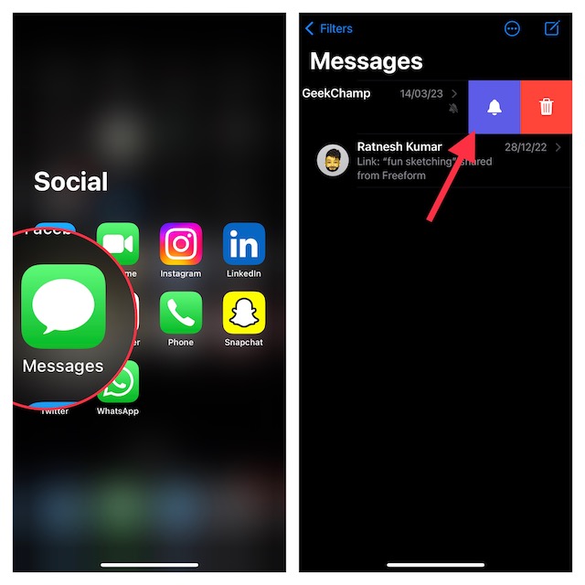 - Deretter sveiper du til venstre på meldingen og trykker på bjelleikonet for å slå på chattråden. Så, ja, du kan bruke denne metoden til å slå på lyden for alle chattrådene.