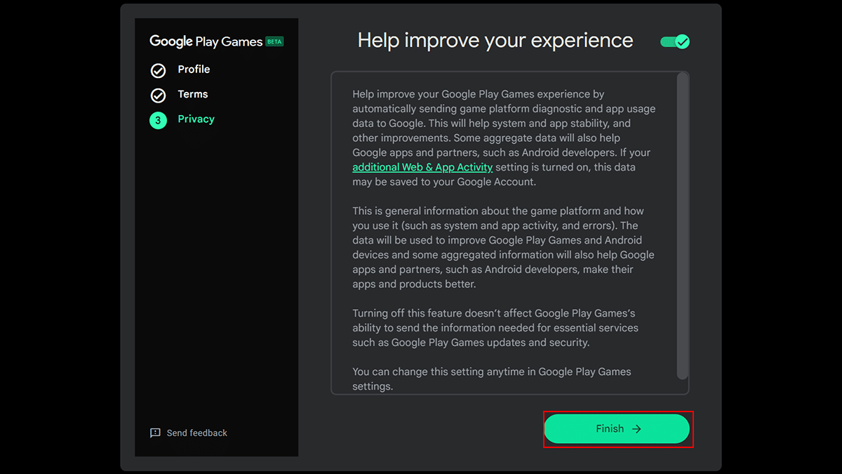 - klikk påFullførknappen for å godta personvernvilkårene.