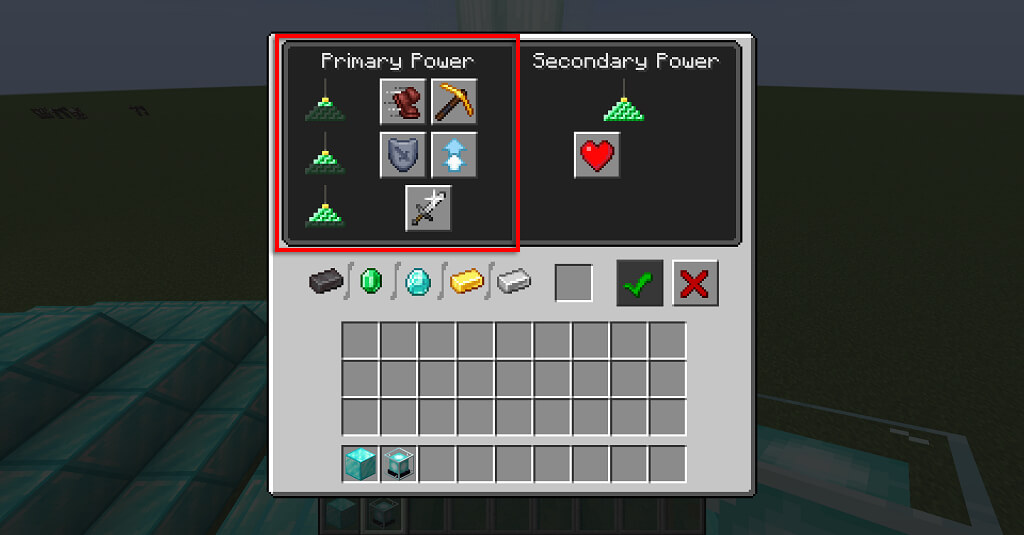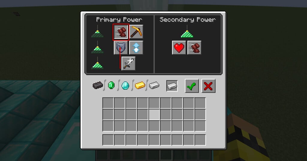 For å aktivere en statuseffekt, må du mate fyret enten med en gullbarre, en jernbarre, en netherittbarre, en diamant eller en smaragd. Slik gjør du det: