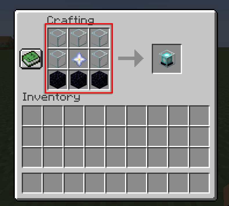 Når du har alle materialene, er det enkelt å lage beacon. Gå til håndverksbordet ditt og legg til tre glassblokker i den øverste raden. På den andre raden legger du til ett glass, Nether-stjernen og et annet glass. På den nederste raden legger du til de tre obsidianblokkene.