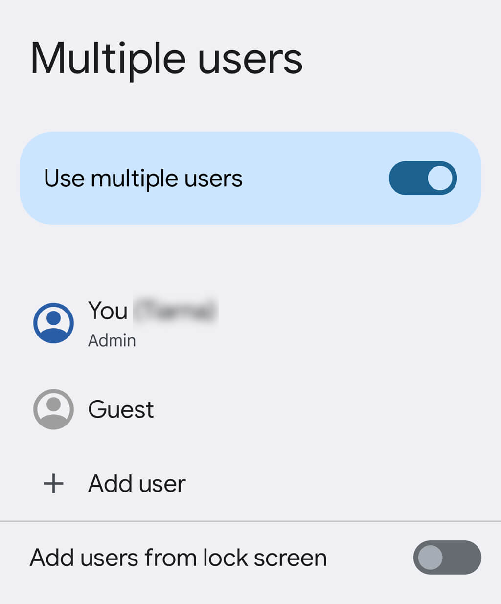 - ÅpneInnstillinger>System>Flere brukere. Du kan også få tilgang til dette ved å sveipe ned fra toppen av skjermen for å få tilgang til hurtiginnstillinger og trykke på personikonet nederst til høyre på skjermen.
