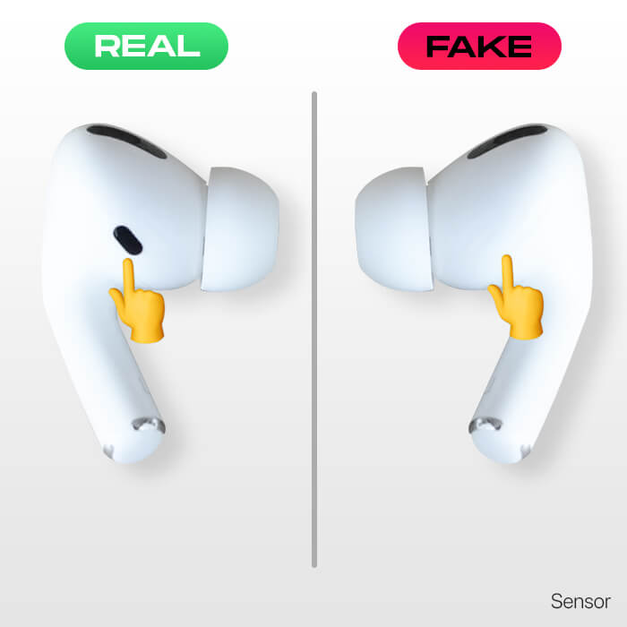I kontrast mangler falske AirPods Pro disse sensorene og har en knapp i stedet for en kraftsensor.