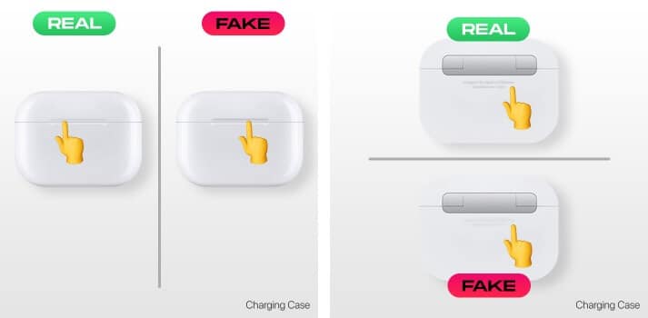 Apple tilbyr en elegant tilpasningsfunksjon på AirPods-deksler, som er fraværende fra forfalskede. Du kan be om å gravere en memoji, tekst eller emoji etter eget valg på AirPods Pro før du kjøper. En gravert AirPod skiller seg ut fra falske AirPods, og det er liten mulighet for at tredjepartsnettsteder kan tilby tilpasning på falske AirPods.