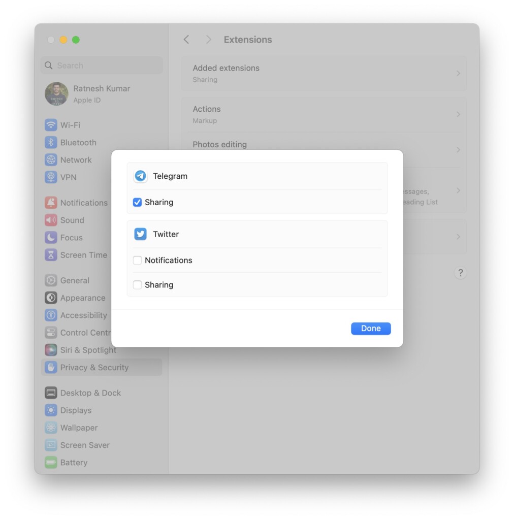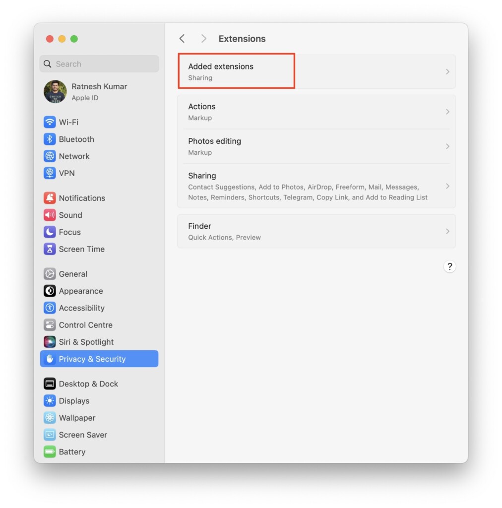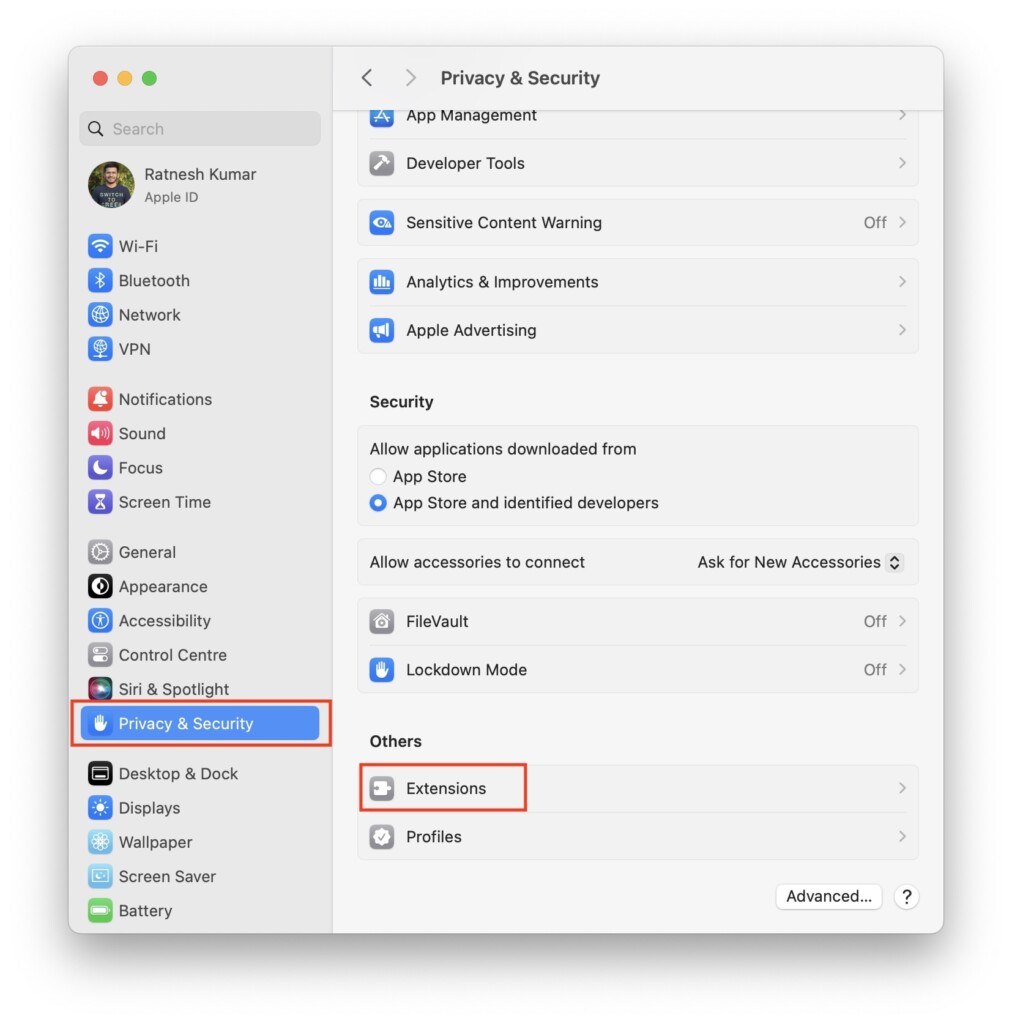 5.Under Personvern og sikkerhet, bla ned helt til bunnen for å finneUtvidelseralternativet under Andre og klikk på det.