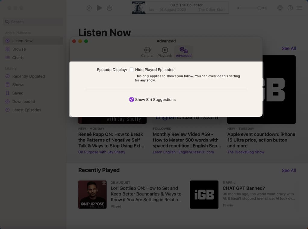 Til slutt, tilpass Podcast-innstillingene dine ved å bruke Avansert-ruten for å skjule avspilte episoder og aktivere Siri-forslag. Den har alternativer som: