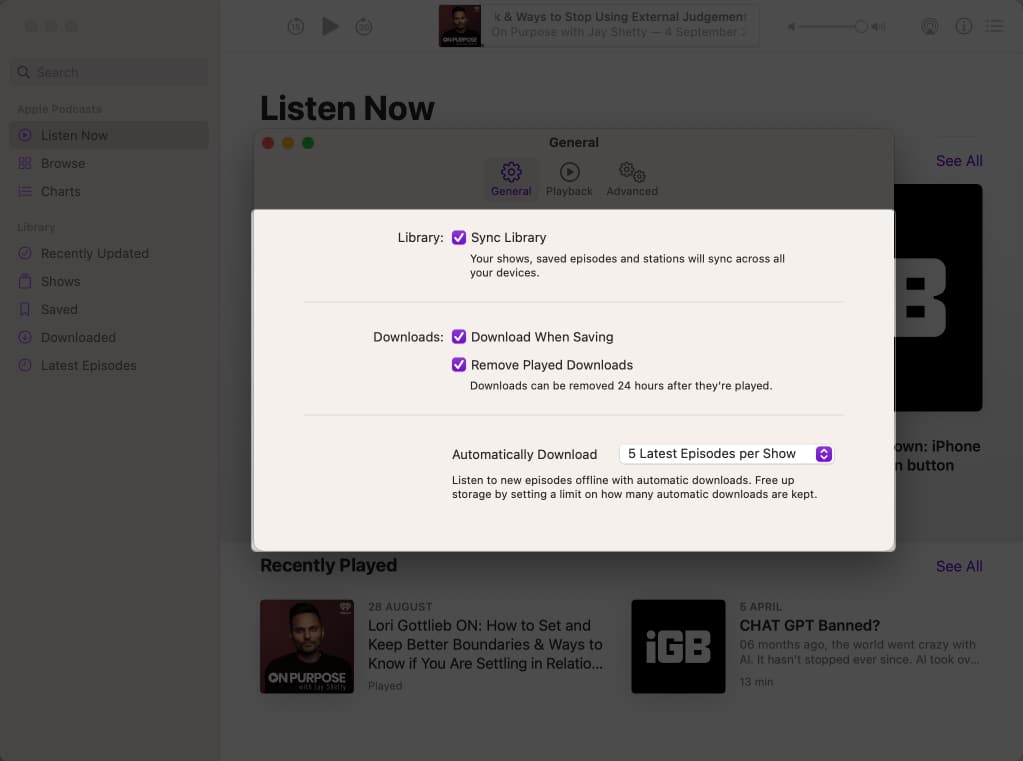 Vel, jeg lovet at denne guiden har alt du trenger for å bruke Podcasts-appen på Mac som en proff. Så her er hvordan du kan endre standardinnstillingene for podcaster.