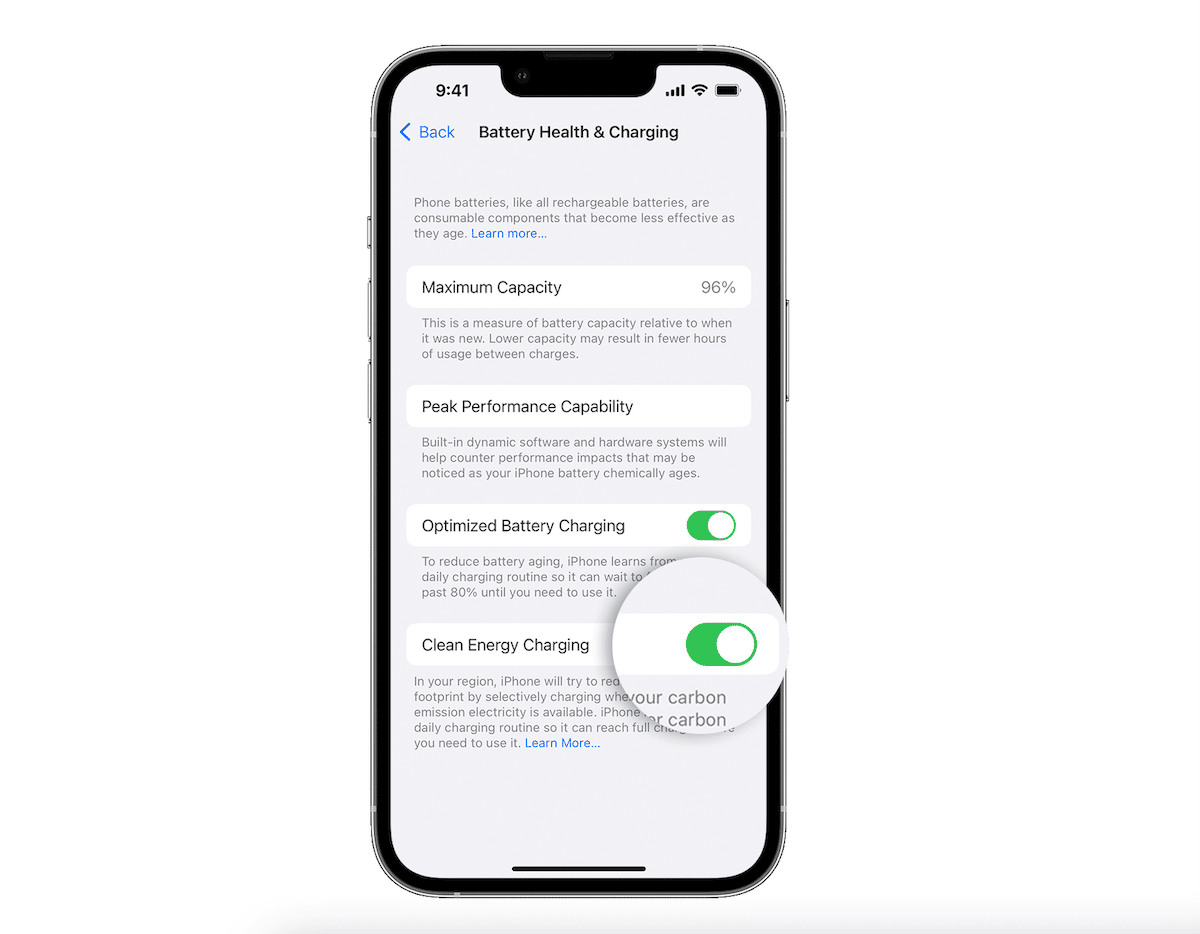 Apple forklarte at "Clean Energy Charging har som mål å redusere karbonavtrykket til iPhone ved å optimalisere ladetidene for når nettet bruker renere energikilder", men funksjonen er bare tilgjengelig i USA, sannsynligvis fordi selskapet vil ha tilgang til nettdata og deres bruk av rene energikilder.