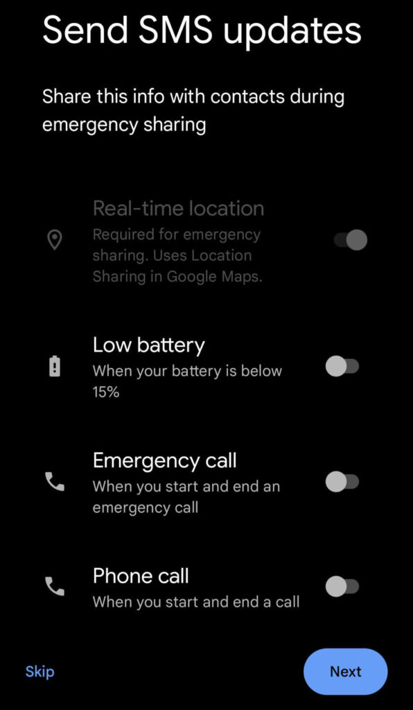 - Først kan du sette opp posisjonsdeling i sanntid for nødsituasjoner. Dette er en relativt ny funksjon. VelgeNestefor å angi nødkontakter ellerNei takkfor å hoppe til neste seksjon.