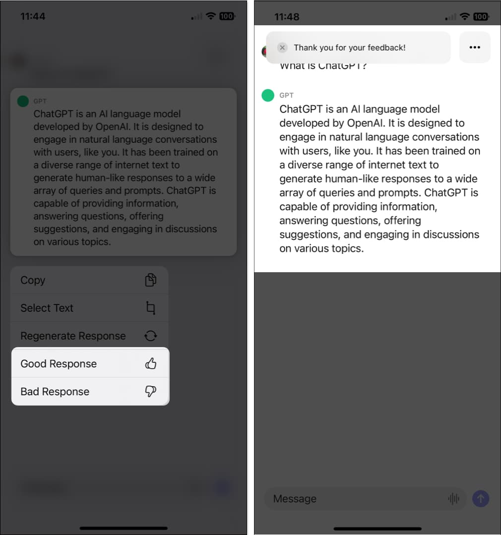 Trykk lenge på svaret og velg entenGod responsellerDårlig respons. Du vil da se en kort melding øverst som takker deg for tilbakemeldingen din.
