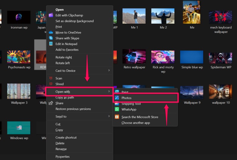 2.HvisBilder-appen er ikke angitt som standard bildevisereller videospiller på enheten din,høyreklikk på bildet eller videofilenfor å vise kontekstmenyen. Hvis du harBilder-appen er angitt som standard bildevisereller videospiller på enheten din, kan du enkeltdobbeltklikk på filen for å åpne denoghoppe over følgende trinn.