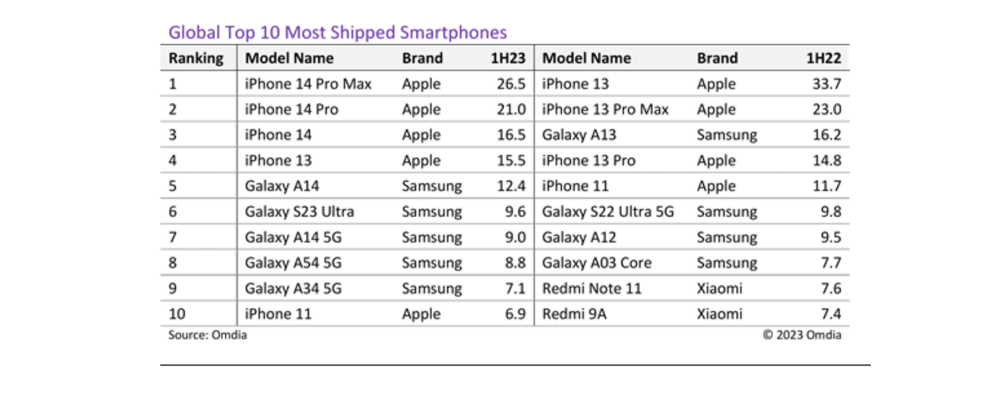 Omdias nye "Smartphone Model Market Tracker - 2Q23"-rapport avslører at iPhone 14 Pro Max var den mest leverte smarttelefonen over hele verden i første halvdel av 2023, januar-juni-perioden.