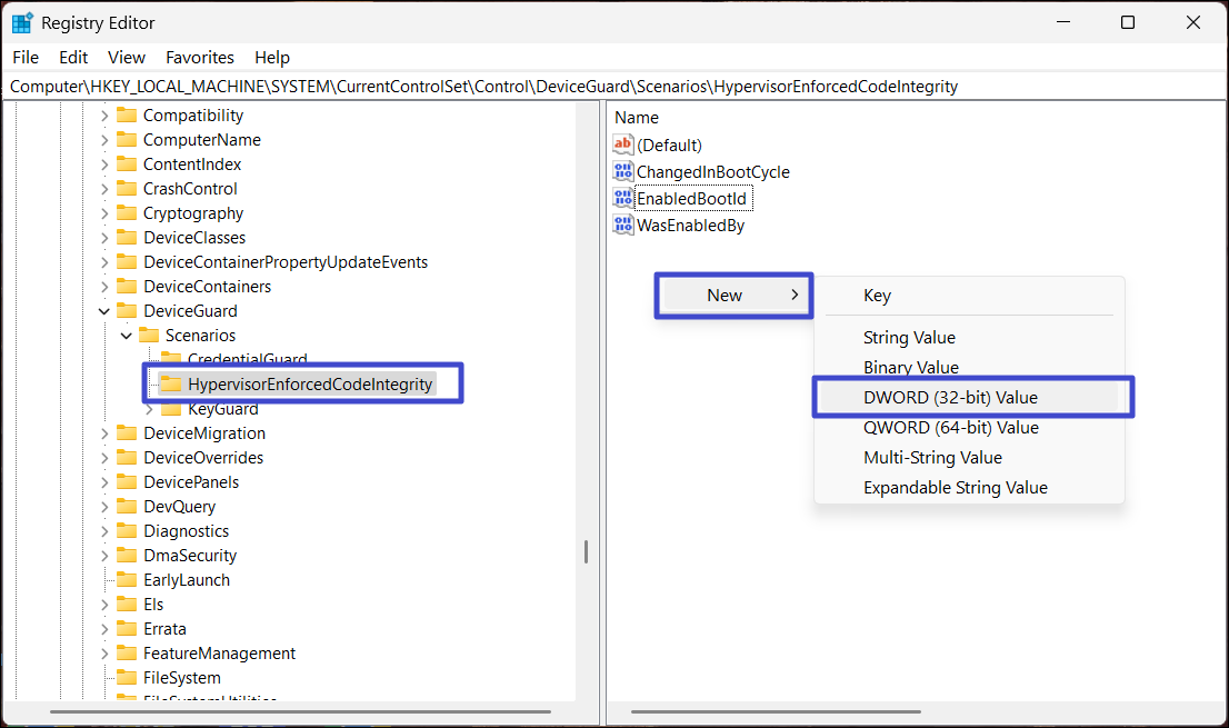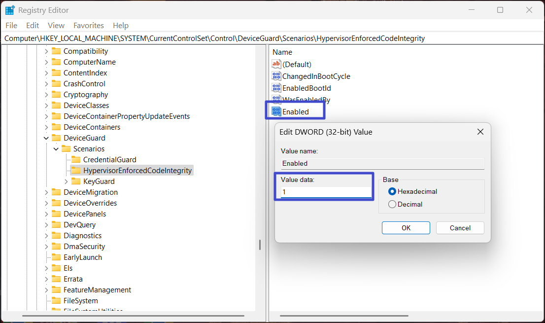 HKEY_LOCAL_MACHINESYSTEMCurrentControlSetControlDeviceGuardScenariosHypervisorEnforcedCodeIntegrity