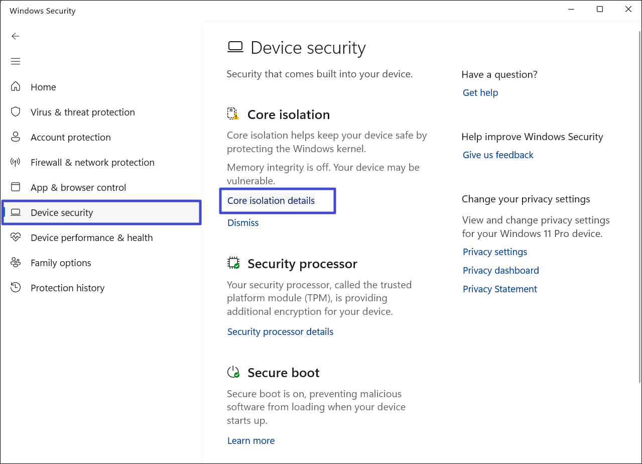 2. Gå til "Enhetssikkerhet" i venstre rute og klikk på "Kjerneisolasjonsdetaljer" til høyre.