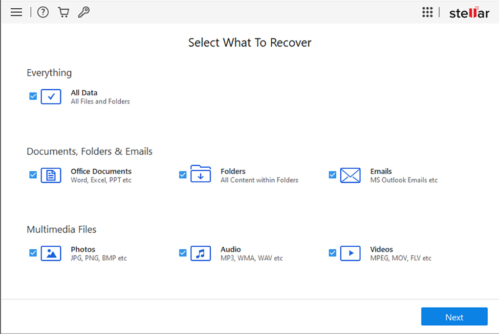 Stellar Data Recovery Free Edition skiller seg ut på hvordanintuitivsinbrukergrensesnitter. Programvaren vil lede deg gjennom hvert trinn i gjenopprettingen av data, med lite rom for feil. Bare velg hvilken type fil du vil gjenopprette og hvorfra, og deretter stedet du vil at de gjenopprettede dataene skal lagres. Enkelheten gjør den tilgjengelig for alle brukere, også studenter som sjonglerer med kurs og tidsfrister.