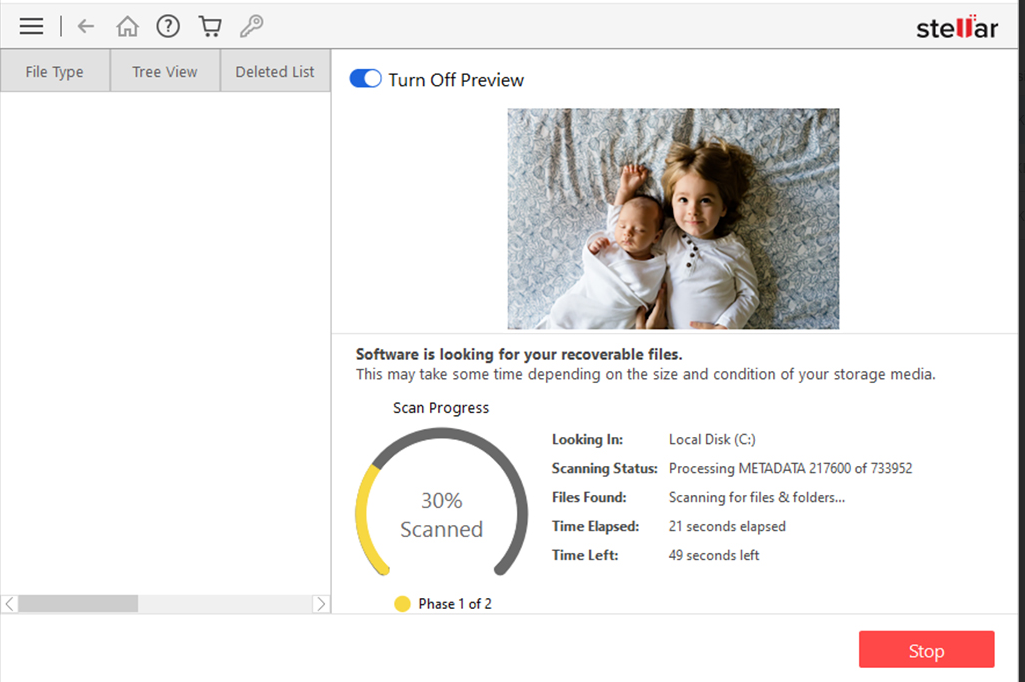 Du kan velge mellom aHurtigskanningfor nylig slettede filer og enDeep Scanfor å gjenopprette data fra formaterte eller ødelagte stasjoner. Stellar er fleksibel, og målretter gjenopprettingsprosessen til din spesielle situasjon. Ogsåforhåndsvisningfunksjonen lar deg bekrefte filene du vil gjenopprette på forhånd, og sparer dermed tid og krefter.
