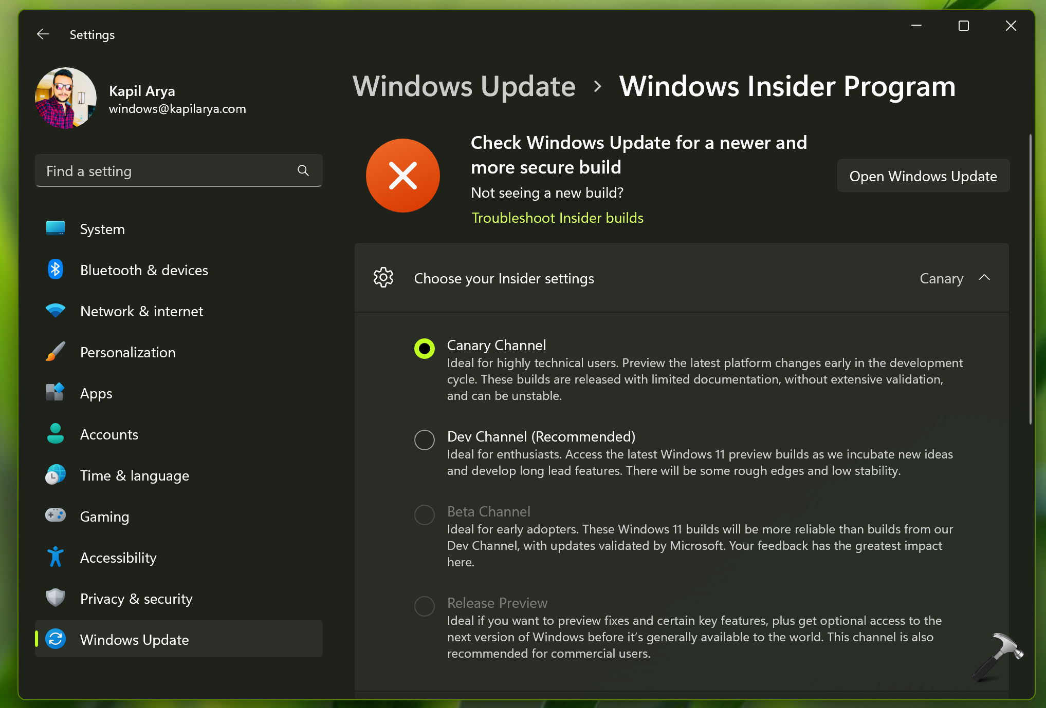 3. Utvid Velg dine Insider-innstillinger. Da kan du velge herCanary Channel.