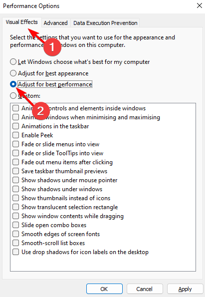 4. UnderVisuelle effekterfanen, sjekkJuster for best ytelsealternativ.