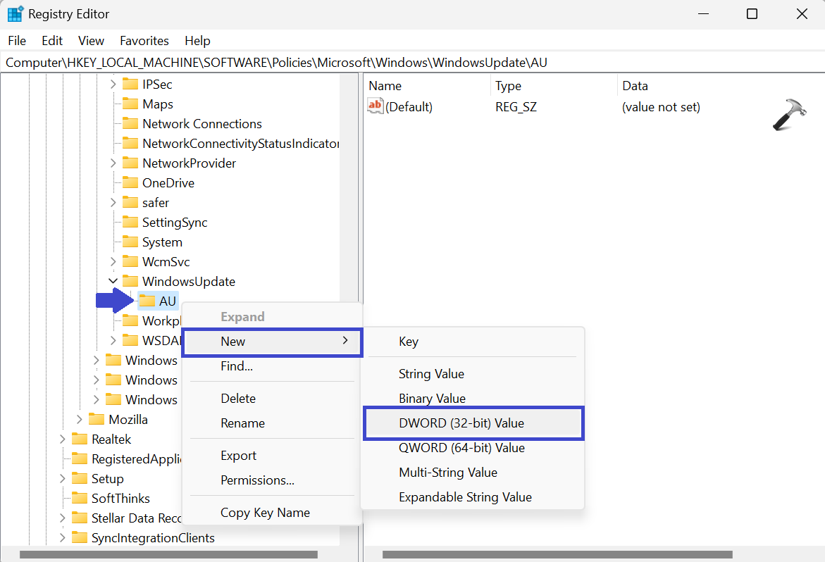 5. Nå, høyreklikk på AU => Ny => DWORD (32-bit) verdi.