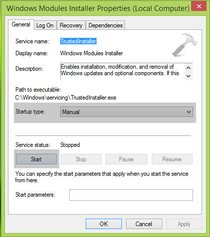 3.Til slutt, i Egenskaper-vinduet vist nedenfor, sett oppstartstypen til Manuell. Klikk ogsåStartknappen for å la tjenesten kjøre en stund. Klikk på Bruk etterfulgt avOK. Lukk Tjenester snap-in.