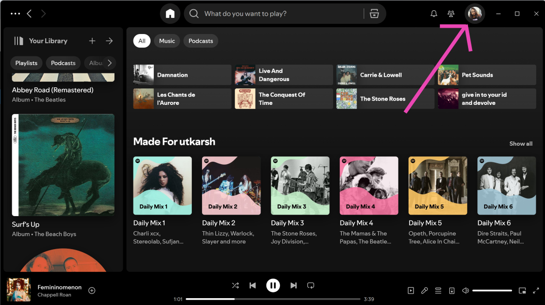 Trinn 1:Start Spotify-appen og trykk på dinprofilbildeøverst på skjermen.