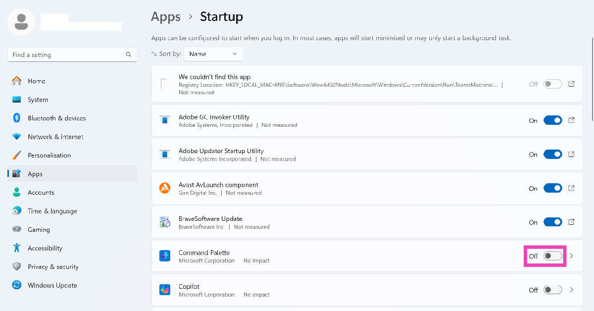 Deaktiver oppstartsapper og -programmer fra innstillingene